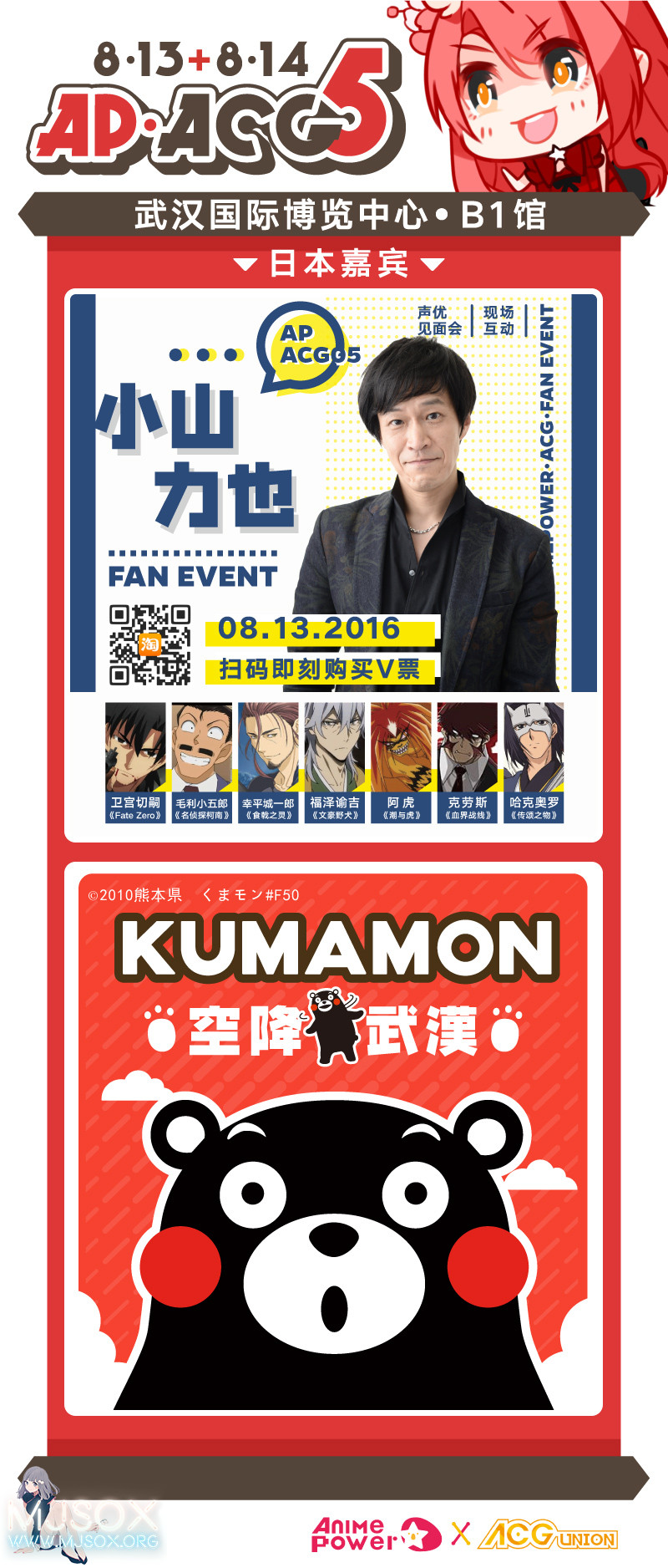 AP05武汉漫展,盛夏最激情漫展! 日本人气声优小山力也盛夏来袭; 日本超萌酷MA萌空降武汉; 超人气coser小梦、小羽、惊艳登场; 灵魂歌手沐帮主现场八点档; 人气舞见绯缨白,食梦棉,还有波利花菜园、武汉AKBingo、SuperJiong团、Aidouru四大舞团联合登场表演!腾讯星漫奖比赛火热开赛更有万元大奖和全国赛名额等着你! 现场免费体验高达制作,国漫精品展映,天涯明月刀现场配音秀,二次元招聘,COSER自由行,TONY大神画展,橙光最新手游现场试玩,半次元精品画展等超多活动让你HIGH到不停! 有萌、虎穴、天涯明月刀、天闻角川、CAPCOM、菠萝饭、橙光游戏、乐元素、MYETHOS、ACTOYS、HOBBY JAPAN等豪华展商汇聚一堂,令你目不暇接! 这个夏天AP05给你带来不一样的动漫盛宴,2016年8月13日—14日,武汉国际博览中心我们不见不散! ★AP05豪华嘉宾阵容 1小山力也见面会 大名鼎鼎的沉睡的名侦探毛利小五郎的配音——小山力也确认登陆AP05!浑厚大叔音还有《Fate/Zero》卫宫切嗣、《潮与虎》阿虎、《血界战线》克劳斯?V?莱茵赫兹、《第一神拳》鹰村守、《传颂之物》哈克奥罗等等代表作品,是不是迫不及待想要去见一下切嗣PAPA了呀!?购买AP05声优见面会VIP门票,就可以和小山叔面对面接触啦!! 2.酷MA萌互动会 熊本县吉祥物酷MA萌要空降武汉啦!!每次看到酷MA萌的照片是不是很想来一个大大的熊抱!这一次你不仅可以看到萌萌的酷MA萌,更有机会和酷MA萌还有酷MA萌的姐姐现场互动哦!现场还有酷MA萌亲自带来的熊本县特产等着你带回家! 2coser嘉宾阵容 黑天工作室超人气coser 小梦、小羽在这个夏天与你相约AP05!还有灵魂歌手沐帮主的现场秀,不仅有不容错过的现场签售会!更有天刀超帅气超还原COSER和你现场互动! 3人气舞见 超人气舞见食梦棉、绯缨白不仅会做为本届星漫奖的评委,更会在现场为大家带来精彩演出!
