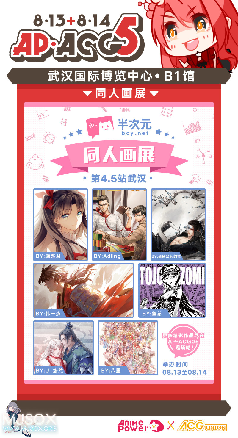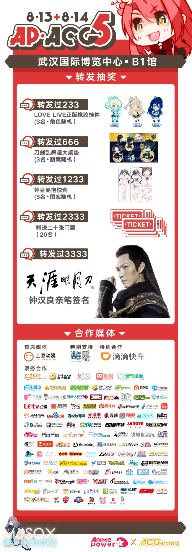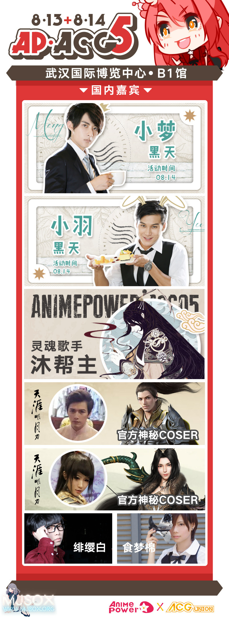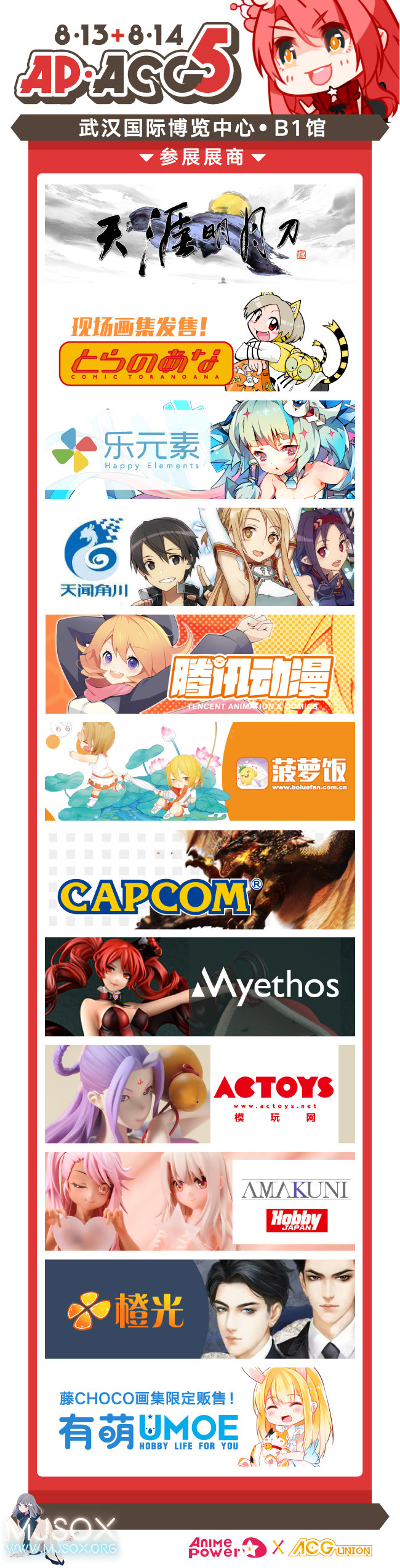 ★天涯明月刀COS文化交流区 天涯明月刀:江湖路远,红尘漫漫。神刀再起,寄情江湖。国内火爆武侠网游天涯明月刀这一次带你畅意享受这个美丽浩大,惬意国风的有爱江湖!现场超还原人气COSER,八大门派等身高立绘板,还有一大波妆娘全天待命~带上基友来参加现场游戏,感受海量礼品现场赠送~~ 360度全景玻璃摄影舞台:还在为找不到合适的拍摄地点着急么?还在为如何P掉乱入的抢镜DOGE劳心劳力?还在为抢到拍摄COSER的相机位而做现场高难度瑜伽么?这一次!AP05给你们统统解决啦!全天免费开放360度玻璃舞台给你机会展示最美的自己! 社团招募:AP05社团招募开启啦!限量20个社团展示位等着你展示自己的社团风采!带上自己与众不同的周边,来一场欢乐大PARTY吧! ★实力展商 有萌UMOE:超萌有萌妹带着藤原正版画集,国产动漫长歌行、雏蜂正版周边,限量神威启示录大礼盒,还有海量CAPCOM周边产品和超还原的伊利亚手办哦!关注有萌官方微博,获得更多超赞周边第一手消息哟~~快来买买买!! 天闻角川: 天闻角川携《怪物猎人十周年立体书》《全职高手1》《天行九歌2》《刀剑abec》《御神乐4》《栗丸堂2》强势参展AP05啦!!只有买买买怎么够!现场还有7月热播新番AngeVierge原作实体集换式卡牌游戏现场教学带你玩个痛快! 虎穴: 日本人气ACG专营店虎穴入驻AP啦!现场开设TONY大神画展!!超多精美画作小心看花眼哦!还有更多日本原装正版画册限量发售!! 橙光游戏: 国内热门应用橙光游戏登陆AP05啦~想要DIY游戏么!自己的脑洞已经穿越天际,却没办法把它投入实际?只要你有想法!就可以通过橙光游戏自己DIY游戏!这一次不仅会带来超多最新橙光游戏试玩!还可以现场和橙光游戏面对面交流哦!