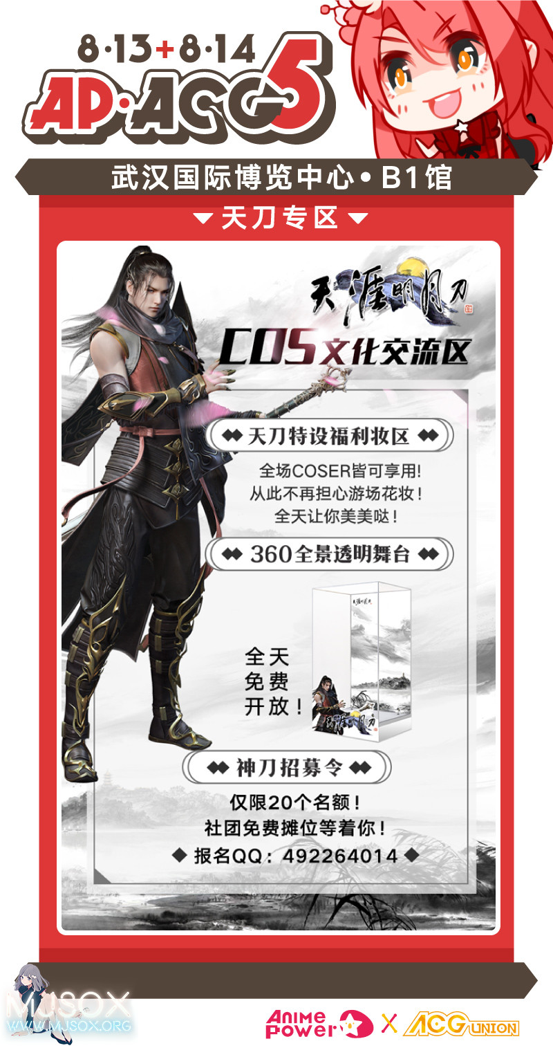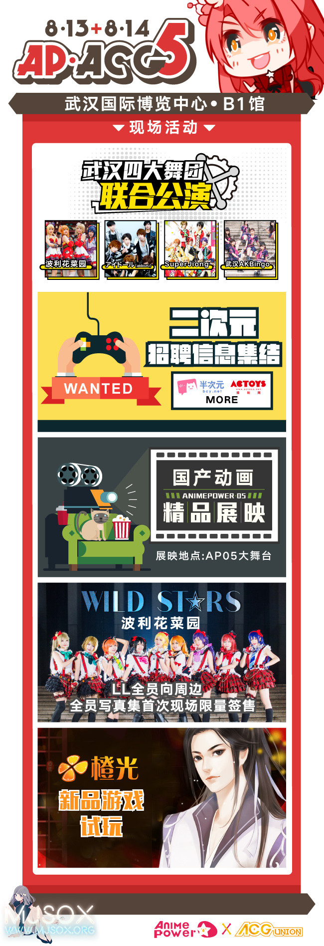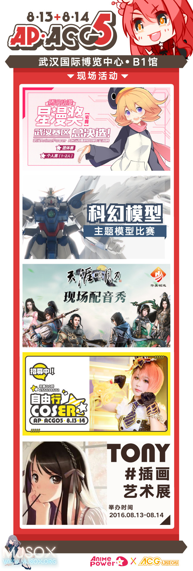 ★精彩舞台活动 更有现场免费体验高达制作,国漫精品展映,天涯明月刀现场配音秀,二次元招聘,COSER自由行,TONY大神画展,橙光最新手游现场试玩,半次元精品画展等超多活动让你HIGH到不停! 1腾讯星漫奖宅舞大赛 夏天不来跳一场舞挥洒热情么!这一次AP05将和腾讯动漫共同打造一个属于你的舞台!不仅可以和波利花菜园、武汉AKBingo!、SuperJiong团、Aidouru同台演出,还有知名舞见食梦棉和绯缨白和四大社团团长做客评委,报名参赛你就有机会斩获武汉赛区万元大奖,更可以进军全国总决赛,还有机会参演网剧一炮而红!来吧!别犹豫啦~无限大的舞台等着你! 2 二次元招聘 在中二的年头也曾想骑着自己的坐骑去征战恶龙;或许放学的路上会跌进井盖传送到新世界;月光落到阳台上的时候或许有人会从空中告诉你成为了被选中的少年。后来长大了,收起了黑白漫画,摘下了眼镜,学会了大人要学会的规则。但是,你真的忘记了么?少年们啊!这一次!你被选中啦!AP漫展开启了超级魔法阵,各大二次元公司邀请你共同开启新纪元! 3 天涯明月刀盖章活动 锵锵锵,不动起来的夏天怎么叫夏天呢!这一次,天涯明月刀神秘现场活动开启啦!还不快施展轻功凌波微步?喊上盟友帮派一起组队荡寇!天涯明月刀周边礼品等着你!