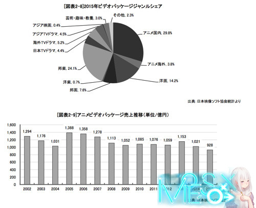 2000 年代:以 PC 电脑普及为背景,DVD 光盘开始普及,2002 年 DVD 影碟机在日本家庭普及率为 19.3%,日本的深夜动画开始重视在海外市场销售租售 DVD,与其说是 TV 动画进化不如说是原本已录像带为载体的 OVA 动画在进化。2003 日本开始在地上波节目放送数字信号 HD 画质节目,2007 年 BD 登场,2008 年 在 BD 终于赢得了 HD DVD 的标准规格之争。2008 年 4 月新番的《Macross F》首次同时发售 BD 和 DVD 光盘,但是由于数字信号画面录影普及,网上的盗版动画泛滥,导致日本动画光盘在北美市场的销售遭遇到了毁灭性的打击,从此圆盘商业模式开始低迷。2011 年日本停止模拟信号电视节目播出,全面进入高清化时代。 2010 年代:网络配信开始流行,BD 播放机录影机普及,北美地区开始发售 BD 规格的视频制品,2015 年支持 4K 画质的「Ultra HD Blu-ray」规格诞生,虽然视频方面的狂热爱好者会尝鲜购买相应的光盘和硬件设备,但普及尚需时日 这就是日本动画视频制品发展的简史,对于动画观众来说购买 BD、DVD 的传统并未改变,在对于高画质和视频制品需求的衰退浪潮中,动画 BD 的销售还算是稳定,但现在以年轻观众为核心的动画正在变得大众化,「既然网上能看的话就不需要花钱买光盘」的动画观众逐渐增多,在日本社会远离物欲的倾向 中,动画视频制品商业模式或者说卖盘商业模式衰退是无法避免的。 不过即便是动画的光盘商业模式衰退,但是动画视频制品在日本整体视频制品市场领域的份额依旧是最大的,2015 年日本动画视频制品的份额占到了市场全体的 29.8% 连续九年市场份额保持第一维持在 30% 左右,但从销售额上来看在 2005 年的最高纪录 1388 亿日元后,日本动画视频制品销售额就进入了负增长阶段,2014 年、2015 年连续两年的销售额分别是 13 年和 14 年以来行业历史最低值。 网络配信市场分析2015 年日本动画网络配信市场销售额 437 亿日元较 2014 年增长 7.1%,视频网络配信市场总体销售额 1397 亿日元,也就是动画配信占到了日本视频配信市场份额的 31.1%,这个份额与动画视频制品的市场份额比重 29.8% 很接近,恐怕今后动画配信市场份额比重不太会有更高的数字了。 而动画制作公司本身通过网络配信的市场销售额为 108 亿日元,比 2014 年增加 5.9%,从 2012 年智能机普及以来急速成长的动画配信市场,现在终于有了一种实感。 在 2015 年世界音乐界的实体制品与数字制品的销售额发生里逆转,数字音乐制品的销售额首次反超了实体制品销售额,虽然在影像制品领域依旧是实体制品销售额大于数字 制品,但是如果算上实体制品并不怎么普及的中国市场,可能世界范围内影像制品市场的实体和数字版销售额也会十分胶着。而与美国相比实体制品销售占据压倒性 优势的日本也逐渐真正进入了数字制品配信时代。 目前在日本动画配信领域中,影响最大的就是面向海外市场的作品配信,2015 年日本动画对外销售额为 349 亿日元大增 79%,东映动画在 2015 年财报中就提到「多部作品面向中国市场的配信权销售」为东映动画贡献了重要的业绩,对中国市场的销售占了整体海外销售比重很大一部分,以中国的互联网巨头们为中心的中国企业对于日本动画的干预逐渐增强,为了得到动画在中国的配信权出钱参加制作委员会,而为了让动画达到日本制作的水平还不断增加自己在动画委员会的出资比例,甚至有中国企业在动画制作委员会中出资比例超过 50% 的案例。 这些都让日本动画制作委员会的传统组成结构产生了些许变化,也许从 2016 年到 2017 年以网络配信为中心的日本动画全新商业模式框架将会逐渐清晰 中国资本与日本动画行业的泡沫2015 年日本的 16 家动画制作公司与全世界国家和地区达成了 4345 份合同,而这一数字在 2014 年仅仅为 1022,增长了 4 倍以上,而且日本动画制作公司签约的国家数量也有增多,2015 年是日本动画行业真正积极应对海外市场的起始之年。 2015 年总计有 196 个国家和地区日本日本动画制作公司达成了商业合同,其中对美国合同 298 份,对中国大陆合同 286 份,如果算上香港、澳门、台湾地区签约的合同,整个大中华地区与日本动画制作公司一年签订了 573 份合同占到了日本动画制作公司在亚洲地区签订合同的 38.9%。 2015 年日本动画制作公司和一向被认为封闭神秘的朝鲜签订了 13 份合同这也是日本动画行业第一次与朝鲜方面签订商业合同。 而日本动画制作公司与亚洲地区的商业合同签订数量占到了日本动画制作行业与全世界国家和地区签订合同总数的 38.9%,在亚洲地区中国市场对于日本动画行业的商业来往和商业合作急剧增加。尤其是中国和欧洲对于每年外国制作的动画在本国和本地区的放映是有着数量 上的限制,所以中国和欧洲的公司会购买大量的日本动画播放权储备起来,尤其是中国的视频网站们不仅大量的买,而且给出的购买价格还异常的高。 2015 年日本动画海外销售额狂增 75%,而全世界范围 2014 到 2015 年影像产业全体增长只有 5%,即便是考虑了在中国买买买的影响下,世界影像配信市场有 25% 的增幅,但日本动画海外销售额一年只能增长 75% 实际上是相当异常的状态。 2012 年到 2014 年日本动画在海外的销售额几乎没有什么显著增长,而 如今日本动画在海外市场销售额的增长超过了 2005-2006 年日本动画产业泡沫时的增幅(2005 年到 2006 年由于日本动画 DVD 在欧美市场销