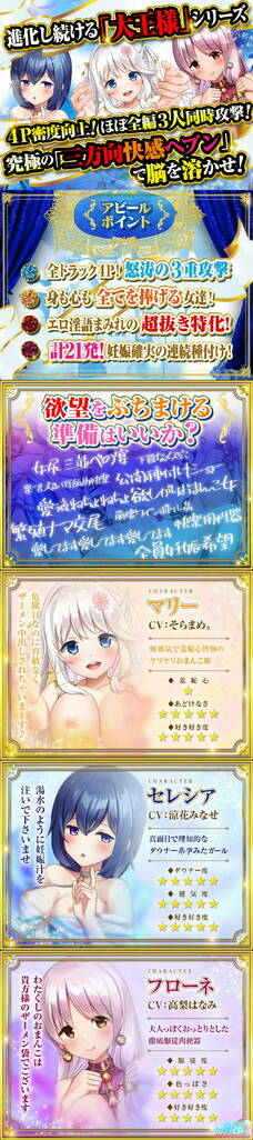 [RJ380363]【究極の三方向快感ヘブン】大王様と後宮の女達-ラブラブ4P編!とことんまで愛してくれる女達に狂ったように中出ししまくって全員孕ませる![CV:そらまめ。/涼花みなせ/高梨は -